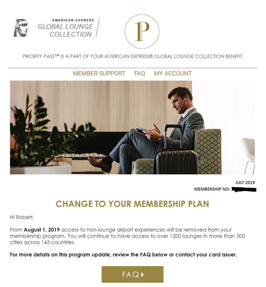 Earlier this week, Priority Pass themselves sent out a notice (right), co-branded with the American Express Global Lounge Collection, specifying that the membership noted in the email would no longer offer the “non-lounge airport experiences” and offering a link to the frequently asked questions (FAQ) for this change.